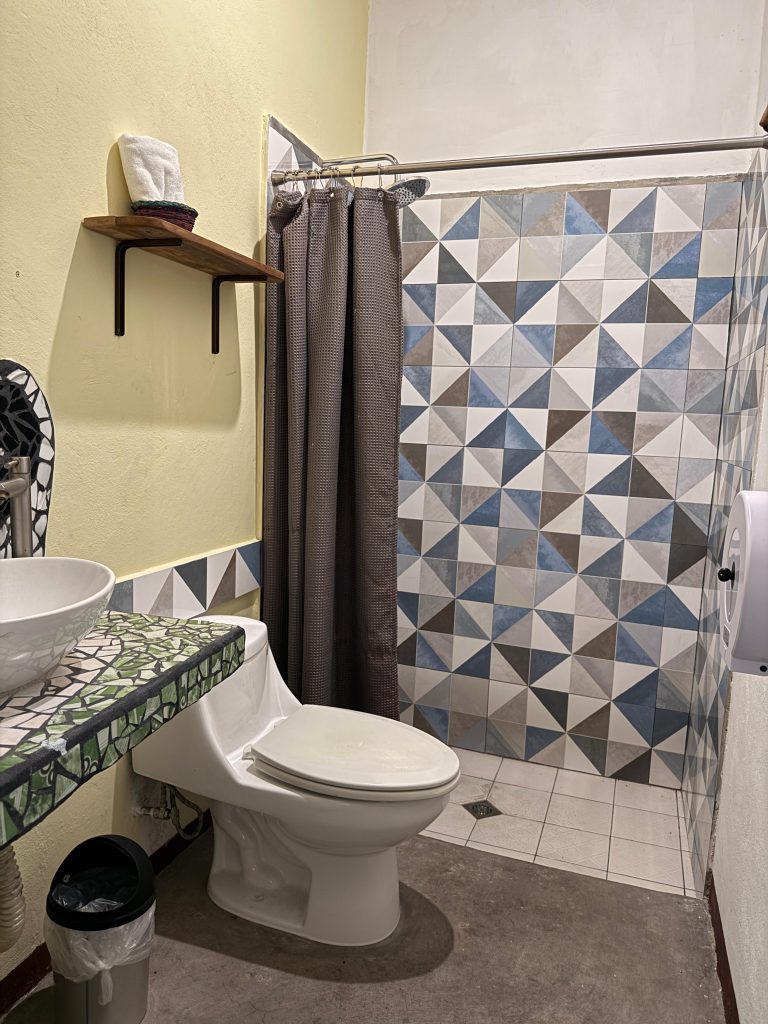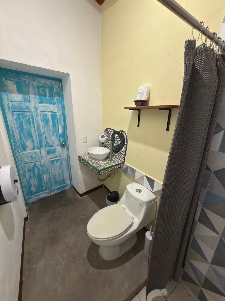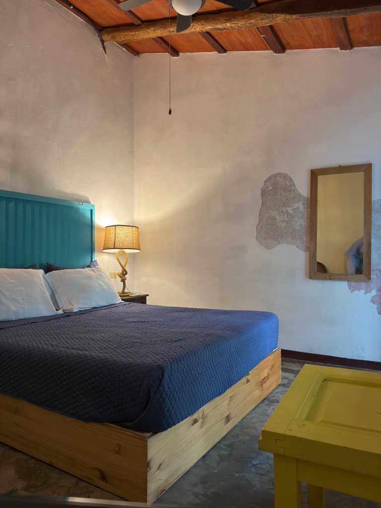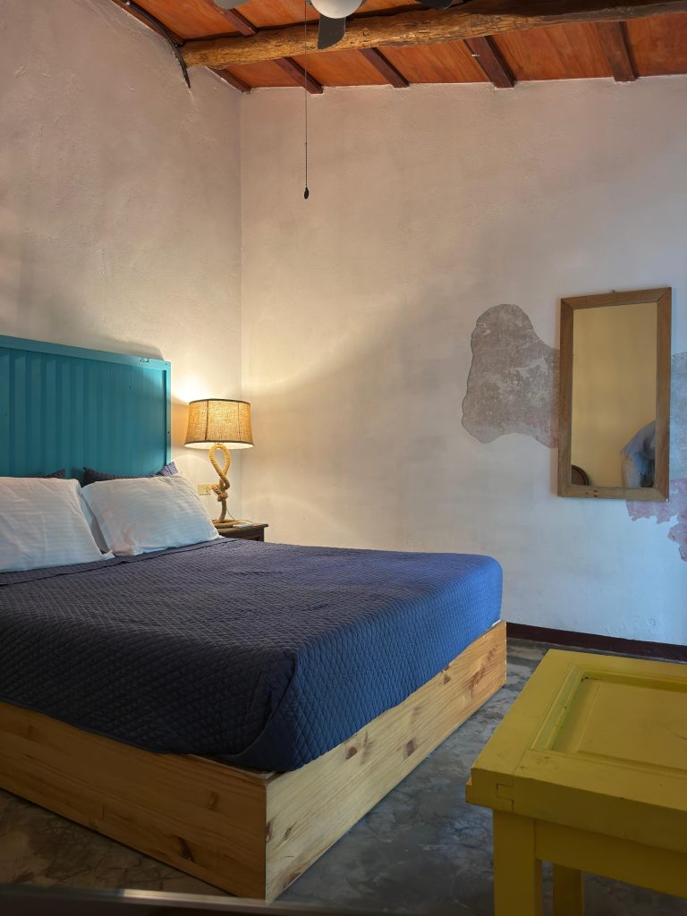 Nuestra habitacion Celeste cuenta con una cama matrimonial y su baño completo. La habitacion cuenta con A/C y es perfecta para una persona o una pareja que desean escapar de la ciudad. Con reservas directas, todas las habitaciones privadas incluyen desayuno.